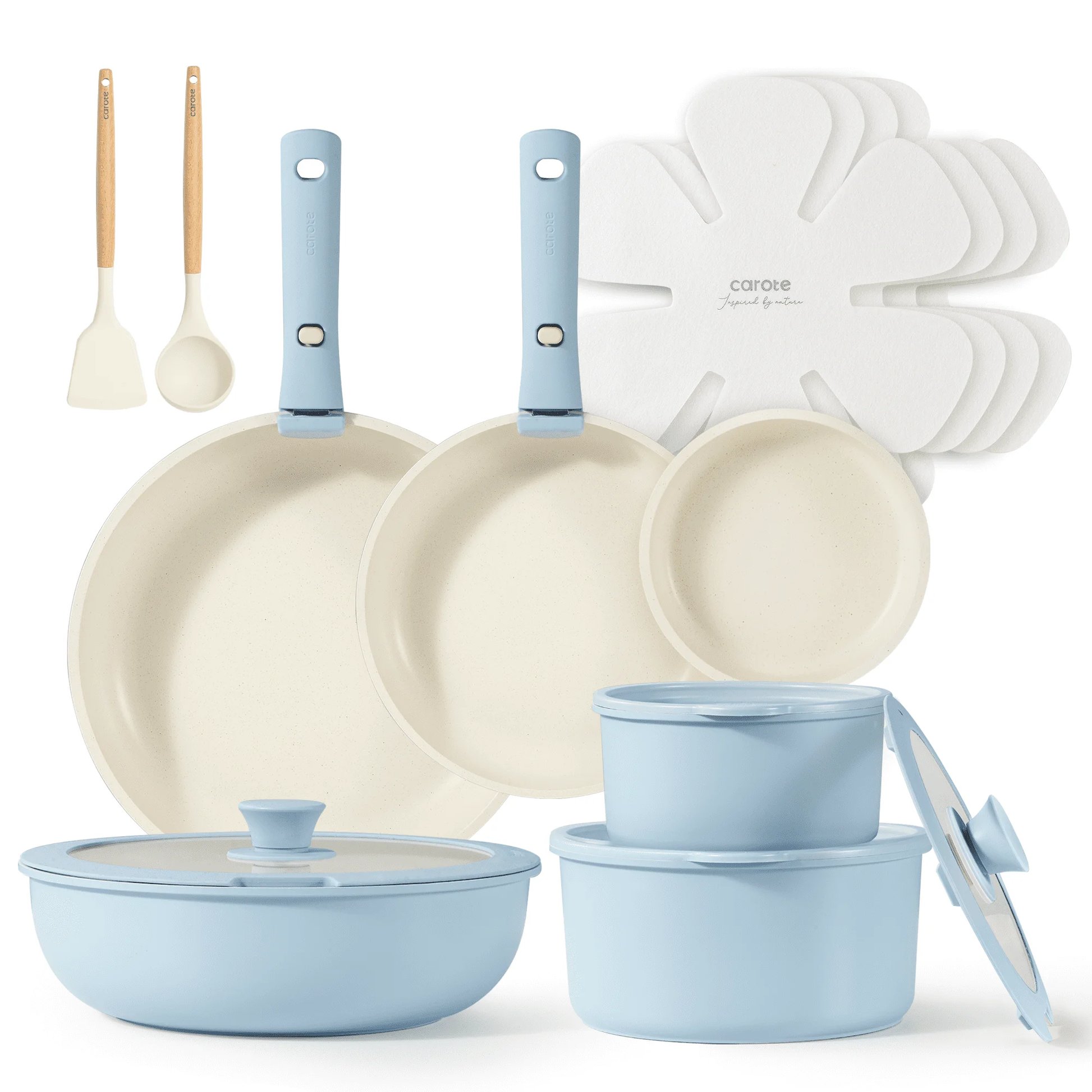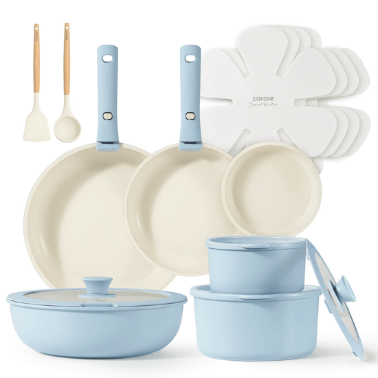 Carote 18-Piece Pots and Pans Set, Nonstick Cookware Set with Detachable Handles, Dishwasher & Oven Safe, Induction Compatible, Stackable RV Kitchen Cooking Set, Blue
