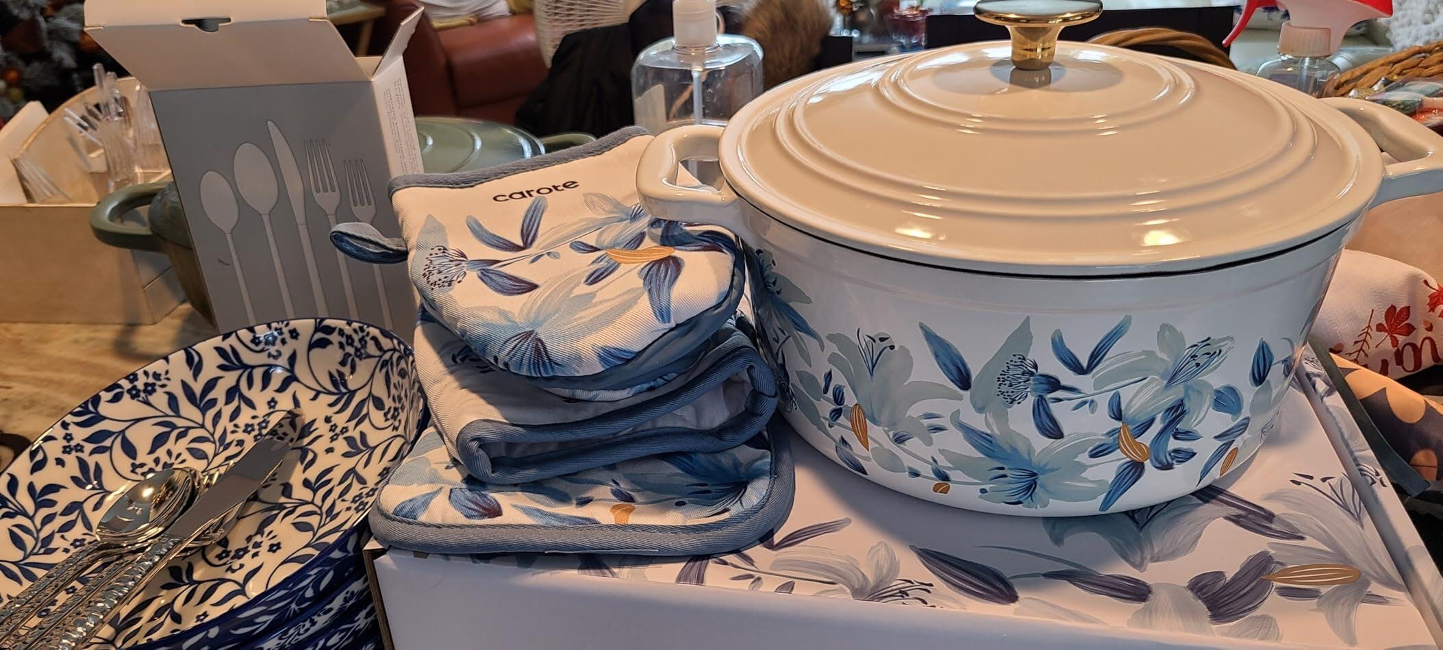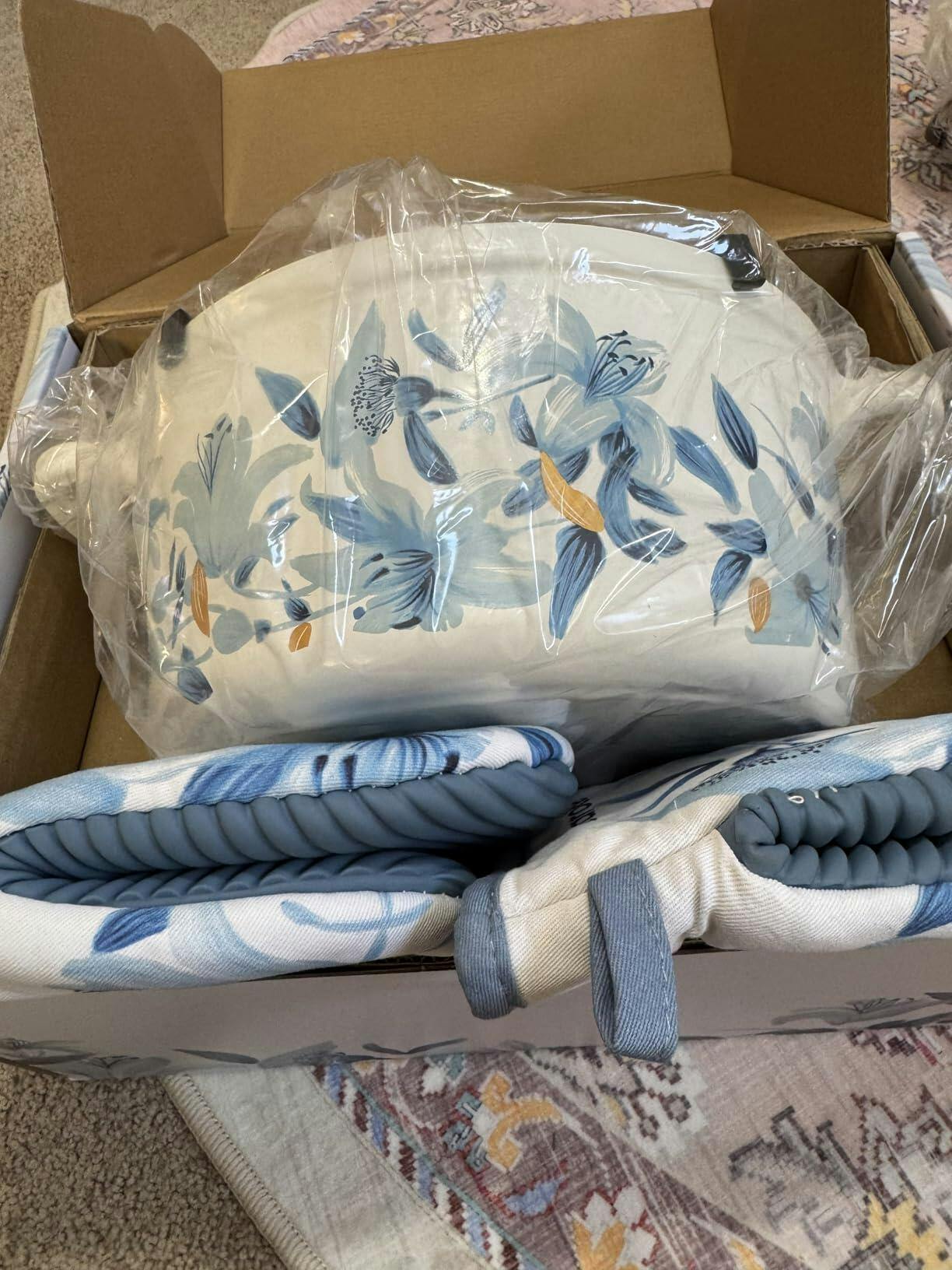 Carote Enameled Cast Iron Dutch Oven Pot with Lid. 1st if awards were given for elgance in cookwear this would win. It is truly a magnificent piece. You want to use it, You want to leave it on your cooktop and it becomes a focal point. THAT is how truly pretty. 2nd It cooks and cleans wonderfully. It is that easy. The enameled layer just simplifies that process. Do not put this in te dishwasher. The lid sits evenly so it keeps the heat in for maximum retention. From Soup, sauce to stew if you make Bread( the new rage) this will be great. The adorable pot holders included are a bonus. This is heavy, it is cast iron. Heat maximum of 500 degrees. If you want to gift someone something they would love this is the item and if you get lucky and catch a sale. It is worth it. Enjoying every moment of this pot.